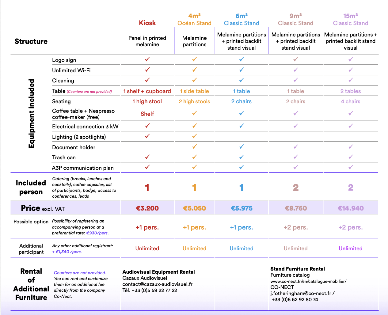- CO-NECT is in charge of setting up the stands for the event. A member of their team will be on hand to provide technical support from Monday, October 6th, 2 p.m. to Tuesday, October 7th, 12 p.m. Exhibitors will be able to contact this technician on site for any technical requests related to their stand.